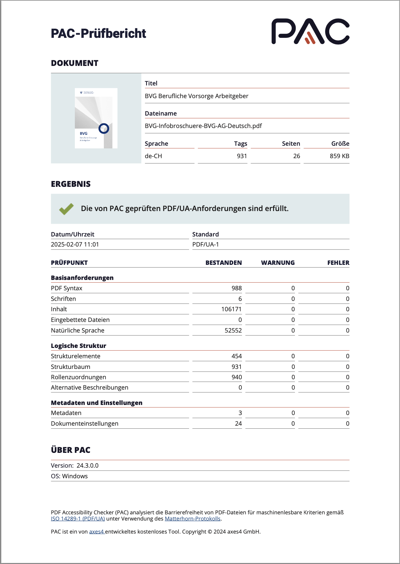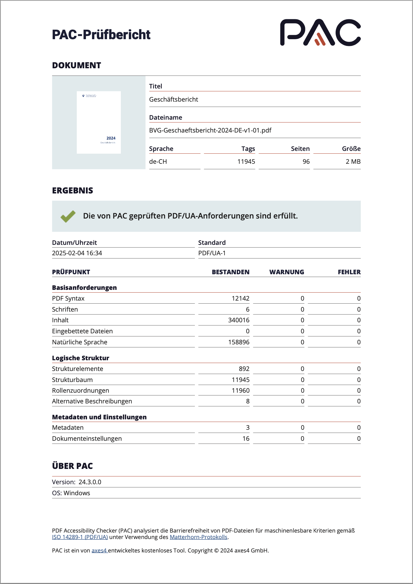 Die PDF`s entsprechen dem bestmöglichen Standard in der Schweiz und sind mit dem PAC 2024 (PDF Accessibility Checker) getestet.