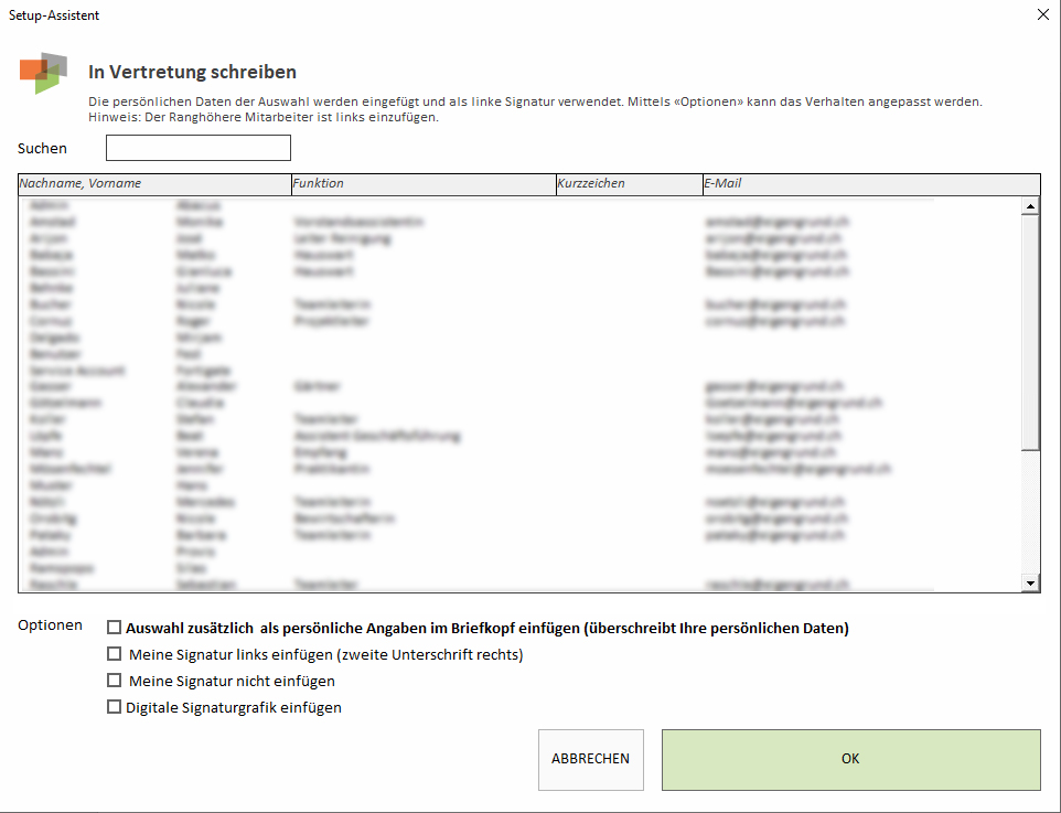 Ebenfalls werden die persönlichen Daten eingelesen. Hierfür werden die Daten automatisch aus dem Active Directory (AD) abgefragt und eingelesen. Wahlweise kann auch die digitale Signatur (Bild-Unterschrift) eingelesen werden.