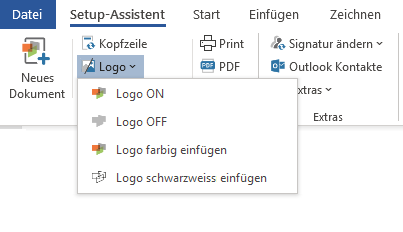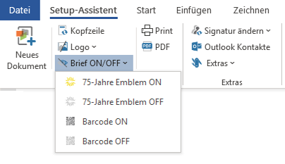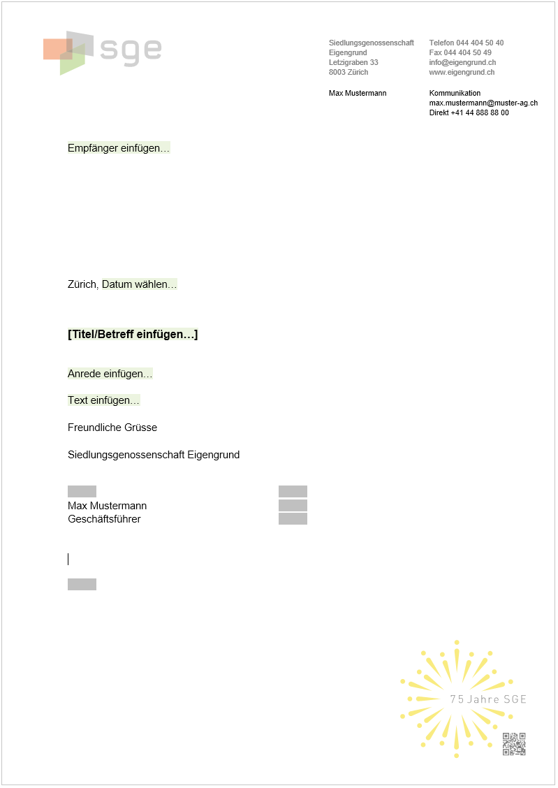 Das Logo kann wahlweise schwarzweiss oder farbig angezeigt werden, sowie ein- und ausgeblendet werden (für vorgedrucktes Briefpapier bzw. PDF). Auch das Jubiläumslogo und der QR-Code kann ein- und ausgeblendet werden.