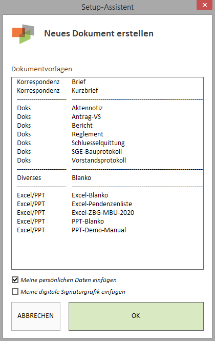 Über den Word Setup-Assistent kann die gewünschten Office-Vorlage (Word, Powerpoint oder Excel) ausgewählt werden.
